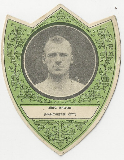 Manchester City. Shield shaped card with portrait of Brook. There is a good biography on the reverse but the cards are anonymous. [very slight creases on the corners of the shield].