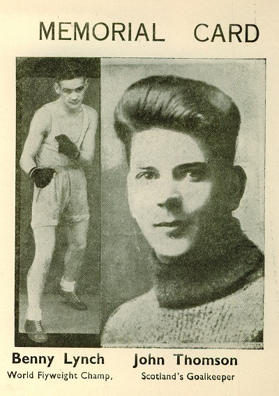John Thomson, Scotland' Goalkeeper and Benny Lynch World Flyweight Champion. Postcard size, green tint. Produced in the 1950s by the Glasgow Evening Citizen but never issued. Plain back. [slight corner knocks].